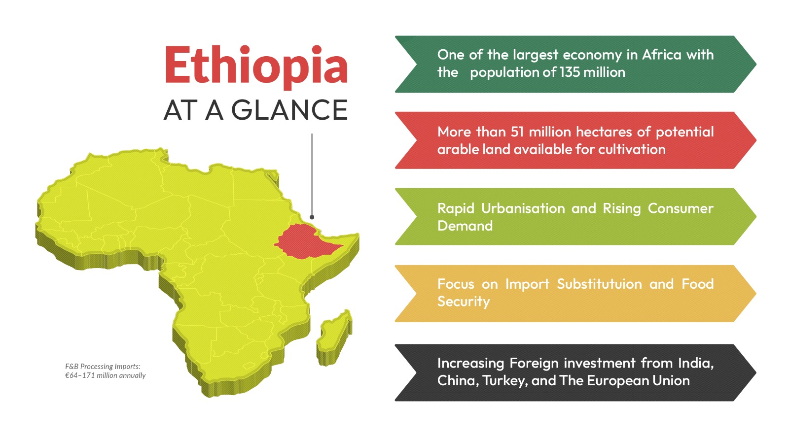 Ethiopia is one of the biggest food markets in African continent, and imports significant amounts of food, primarily including wheat, pulses, and cooking oil. Ethiopia’s total food importation in 2023 touched USD 2.36 Bn and India, USA, Turkey, Djibouti, Malaysia, Indonesia, UAE, Egypt etc. Despite accounting for half the country’s total manufacturing, agro-industries account for only five percent of Ethiopia’s GDP.